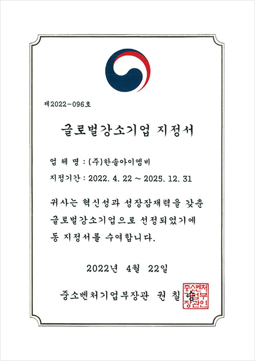 한솔아이엠비, 2022 글로벌강소기업에 선정