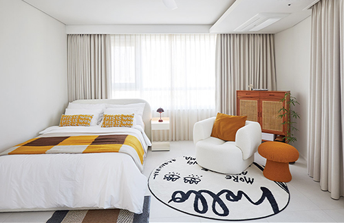 포근한 분위기의 안방 인테리어에도 덱스터 커튼을 선택하였다.